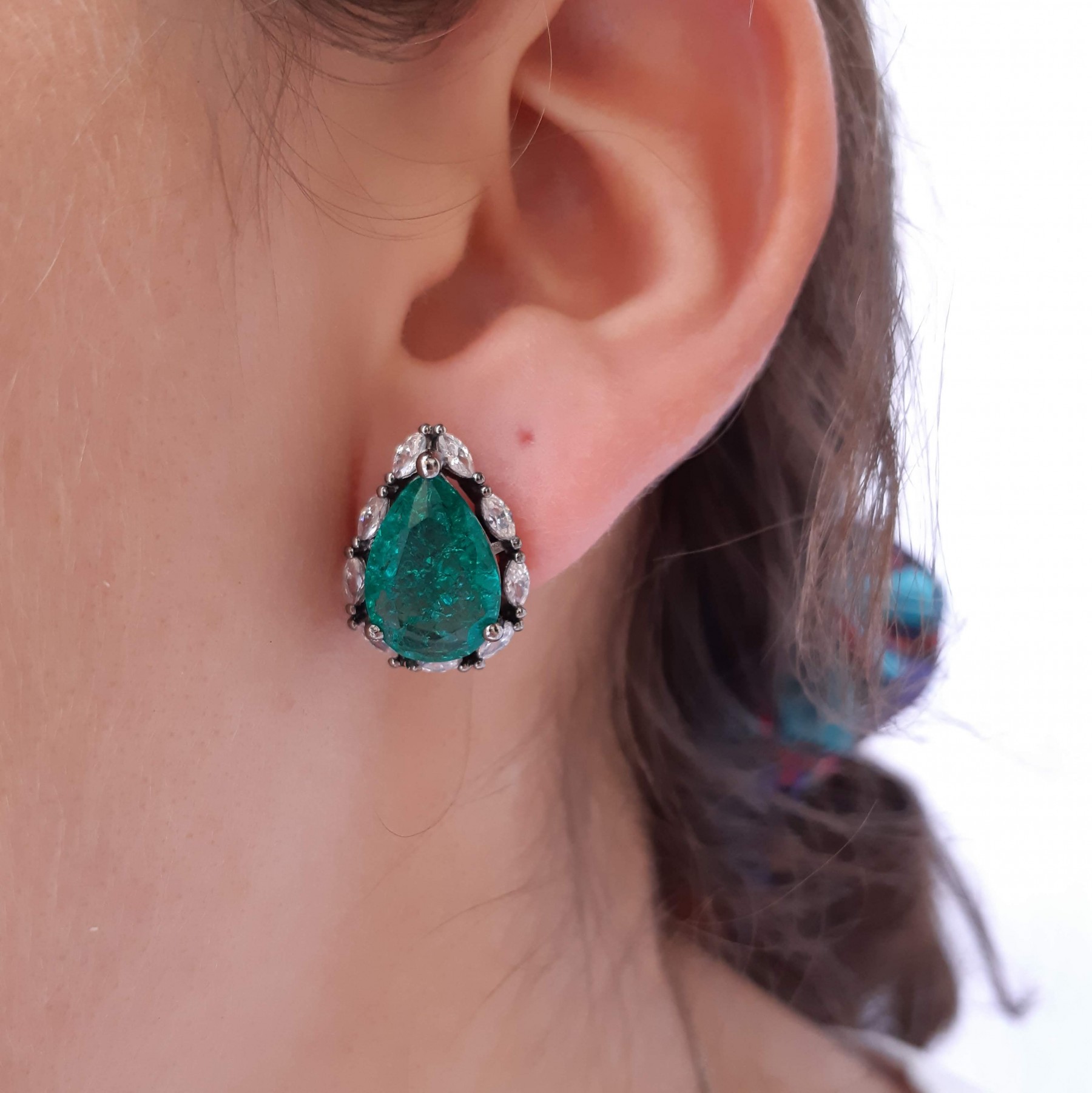 Descrição: Brinco (latão) com pedra zircônia colorida central e pedras zircônia oval em volta. Disponivel nas cores azul turquesa, verde, cristal, rubi, azul e preto.
