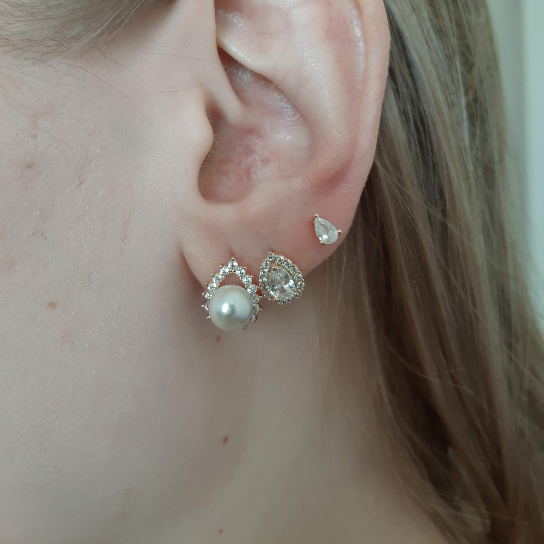 Descrição: Brinco (latão) trio gotas com pedras zircônia, microzircônia e pérola. Disponivel na cor cristal.