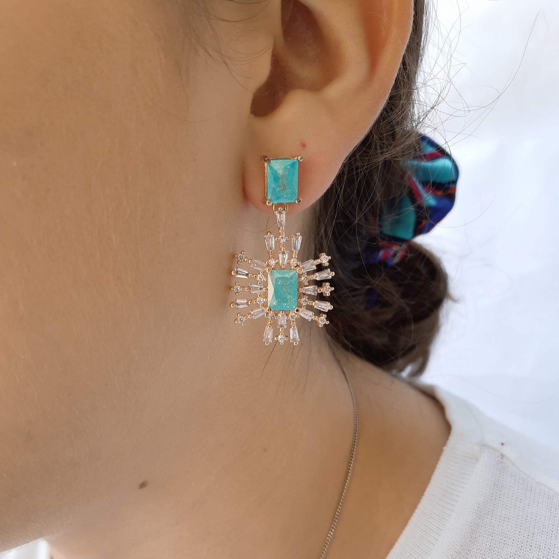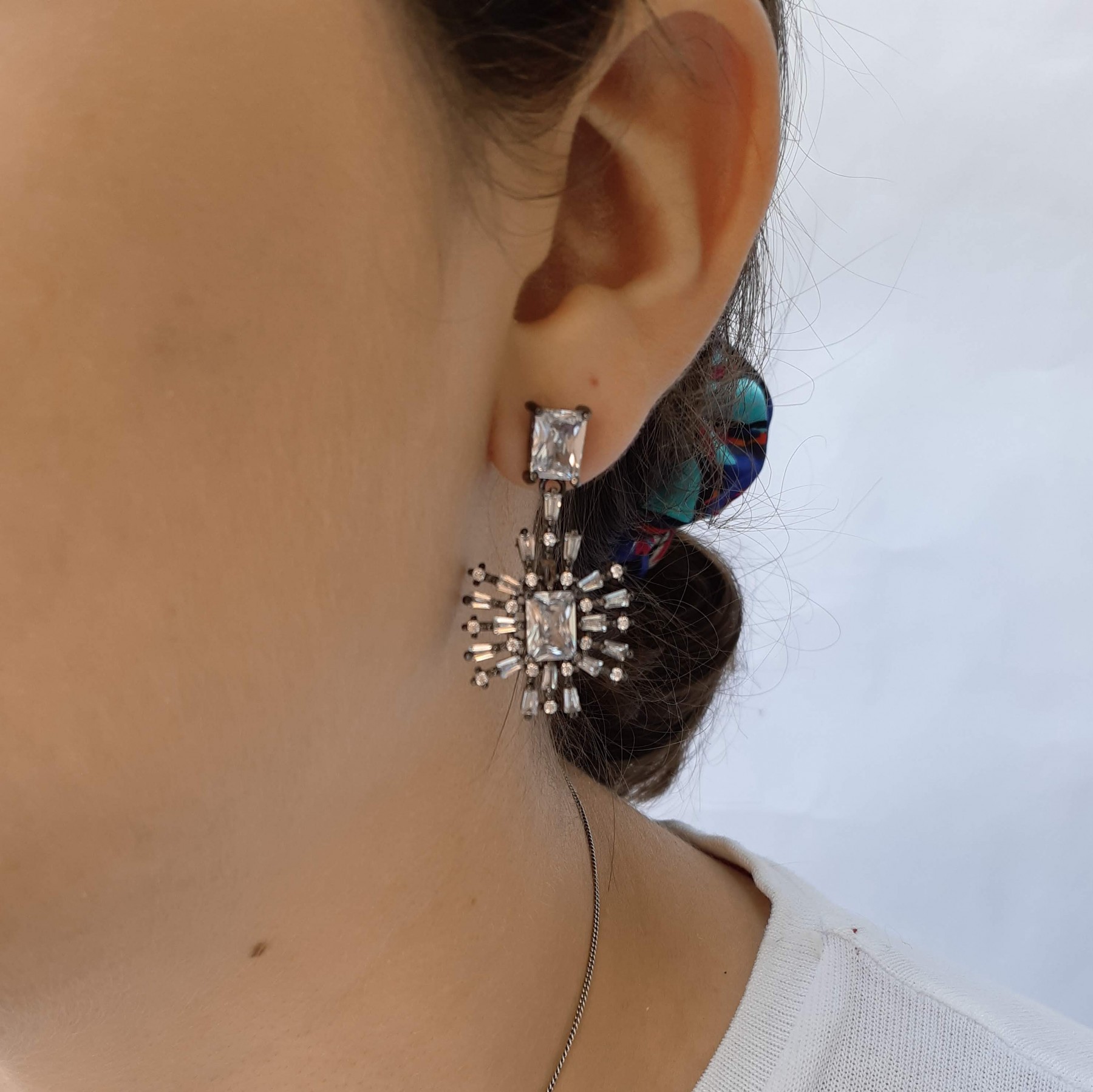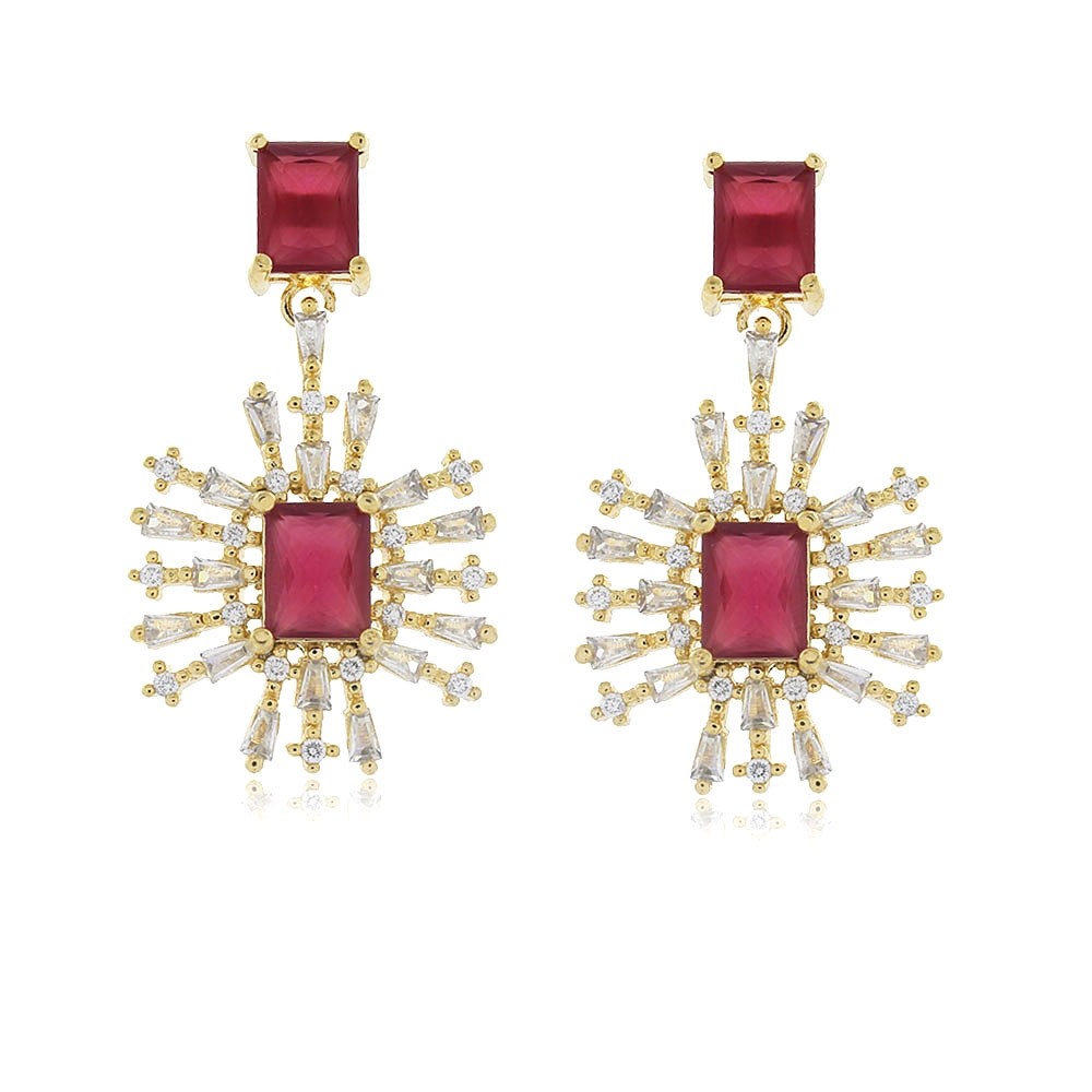 Descrição: Brinco com balanço (Latão) de pedras de zircônia coloridas e cristal. Disponivel nas cores rosa, verde, cristal, rubi e preto.