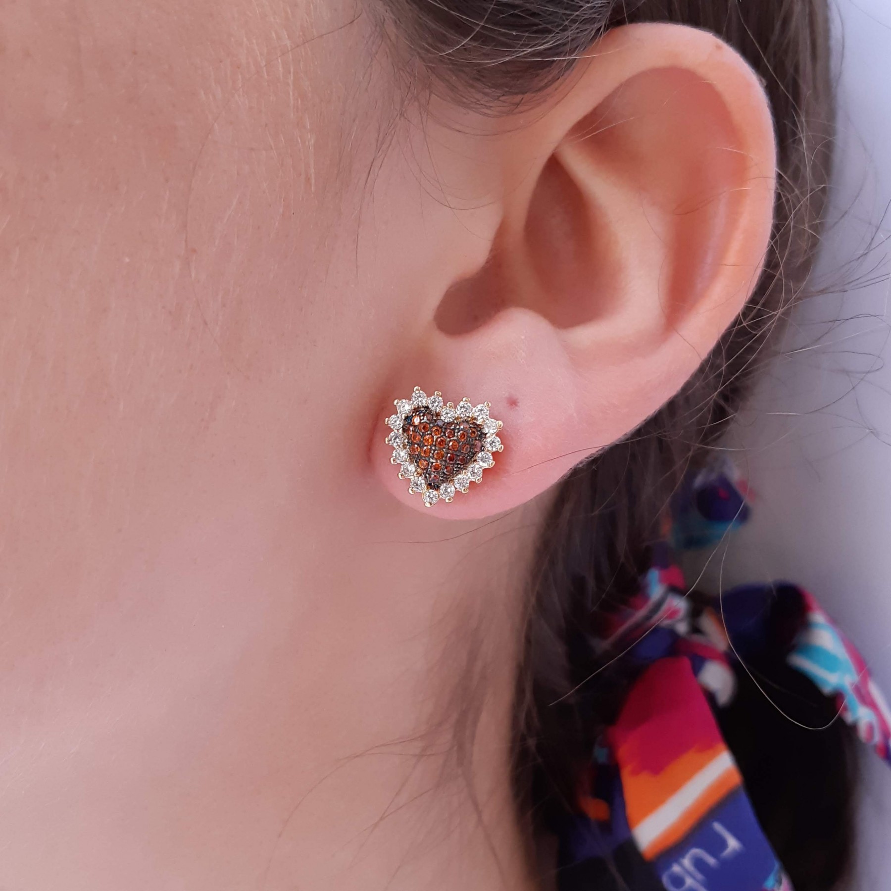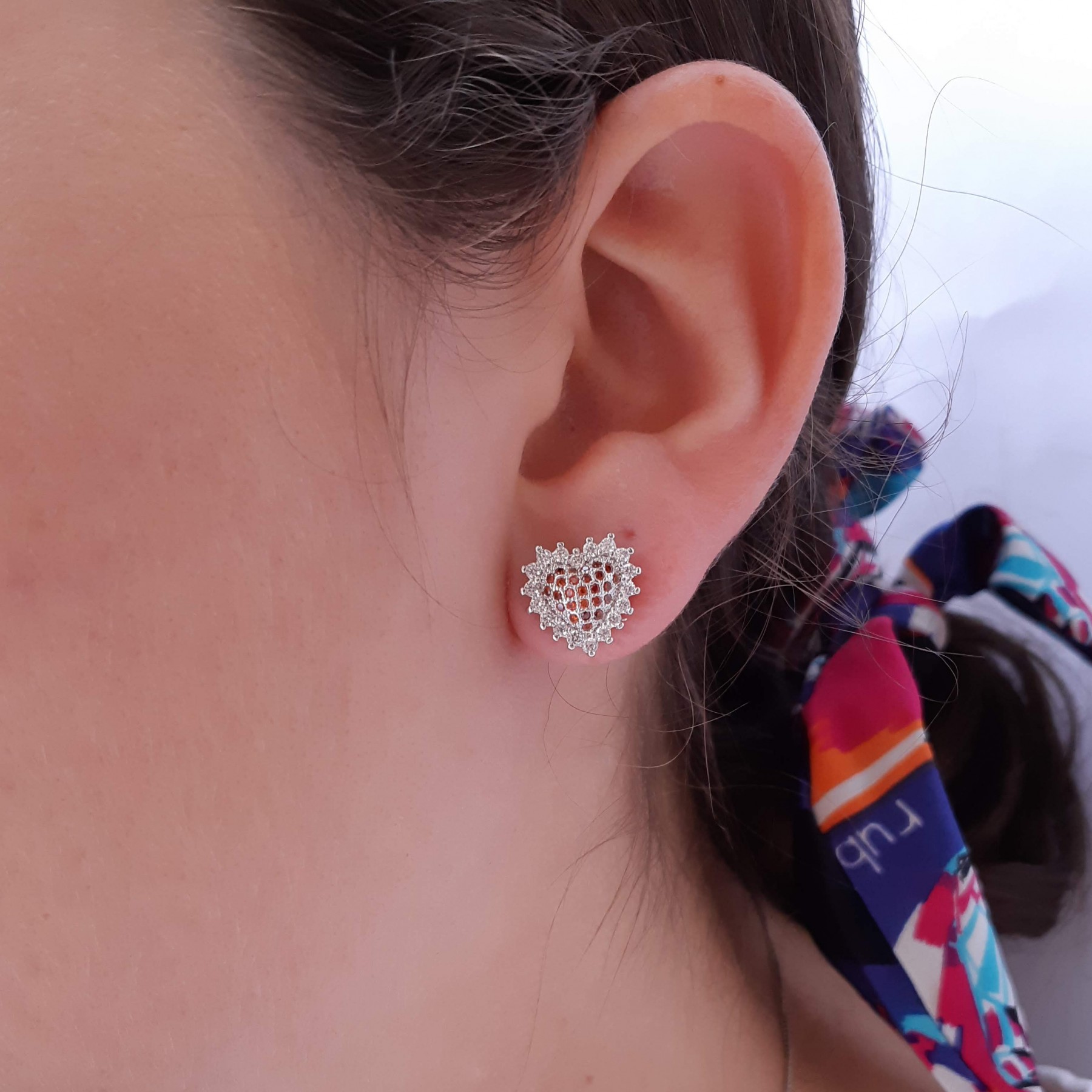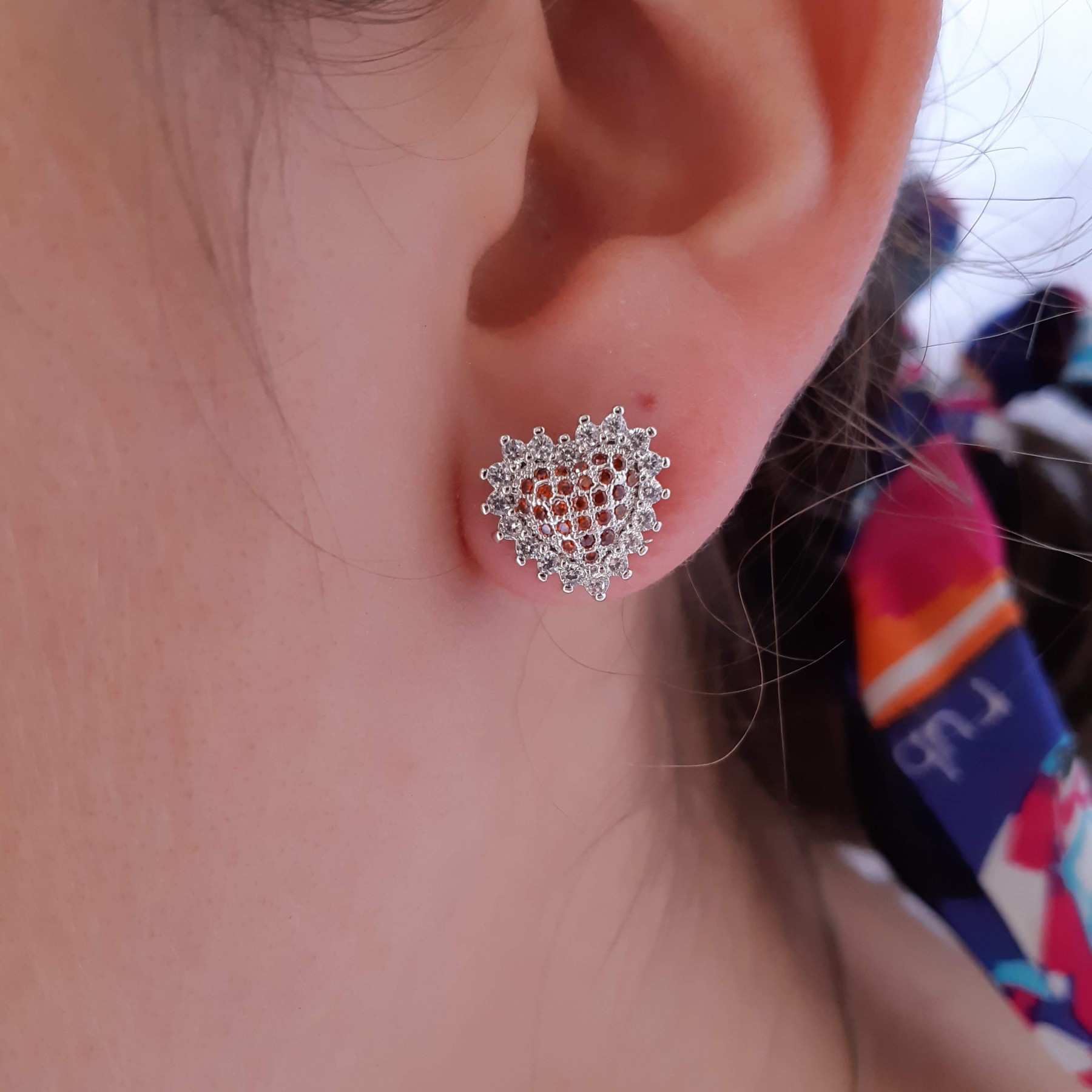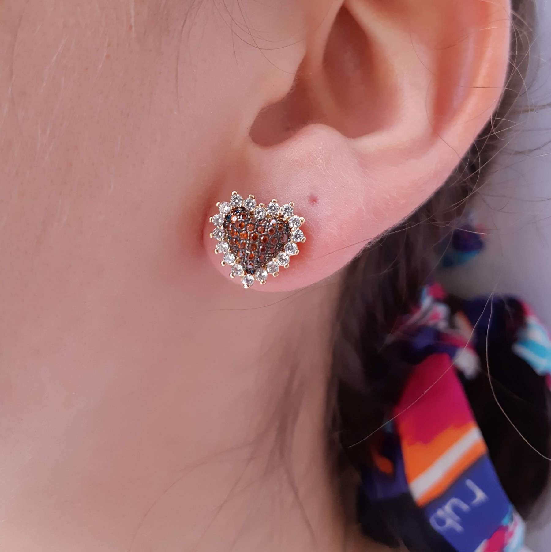 Descrição: Brinco (latão) de coração com microzircônias coloridas e cristal. Disponivel nas cores rosas, azul e laranja.