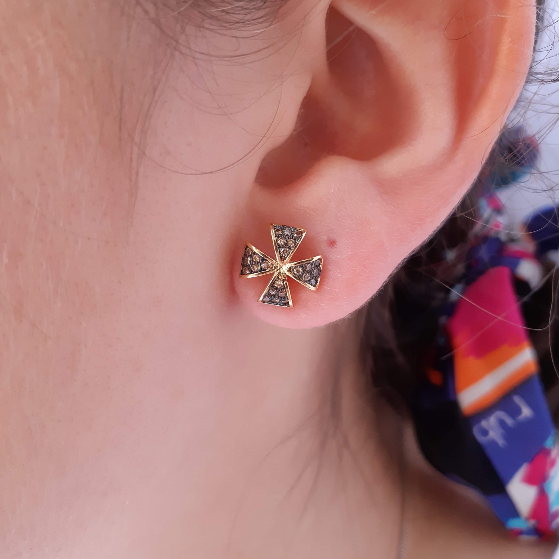 Descrição: Brinco (latão) trevo com pedras zircônia coloridas cravadas. Disponivel nas cores rosa, preto e champanhe.