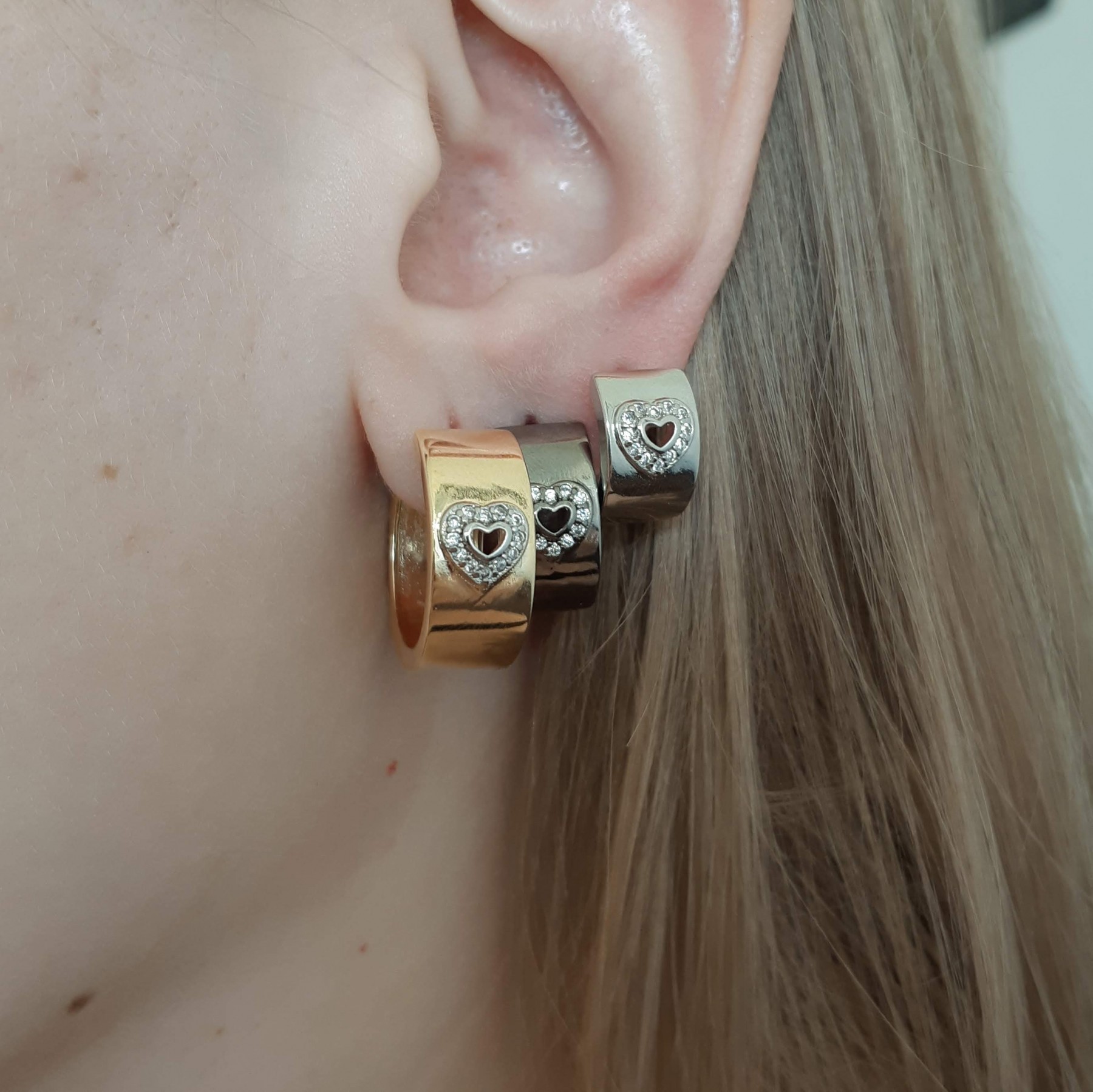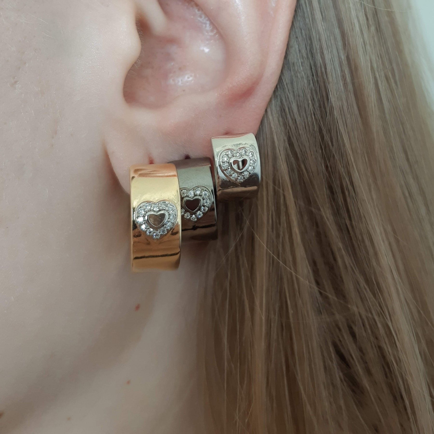 Descrição: Brinco (latão) trio de argolinhas grossas de três diferentes tamanhos + coração trabalhado com microzircônias. Disponivel na cor cristal.