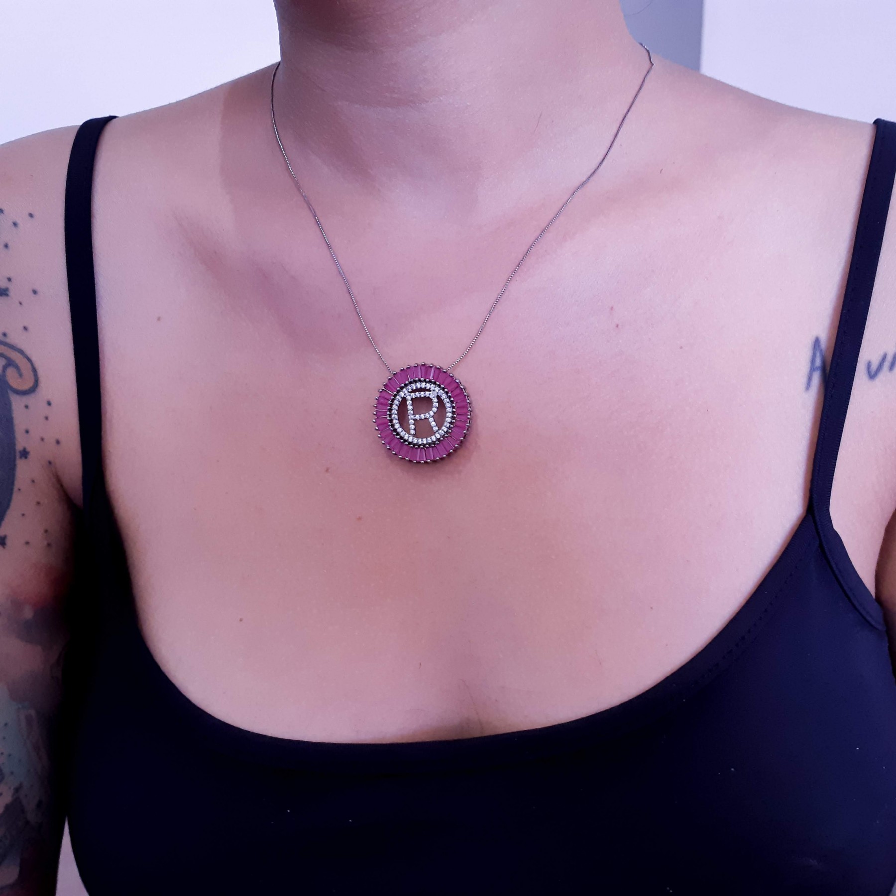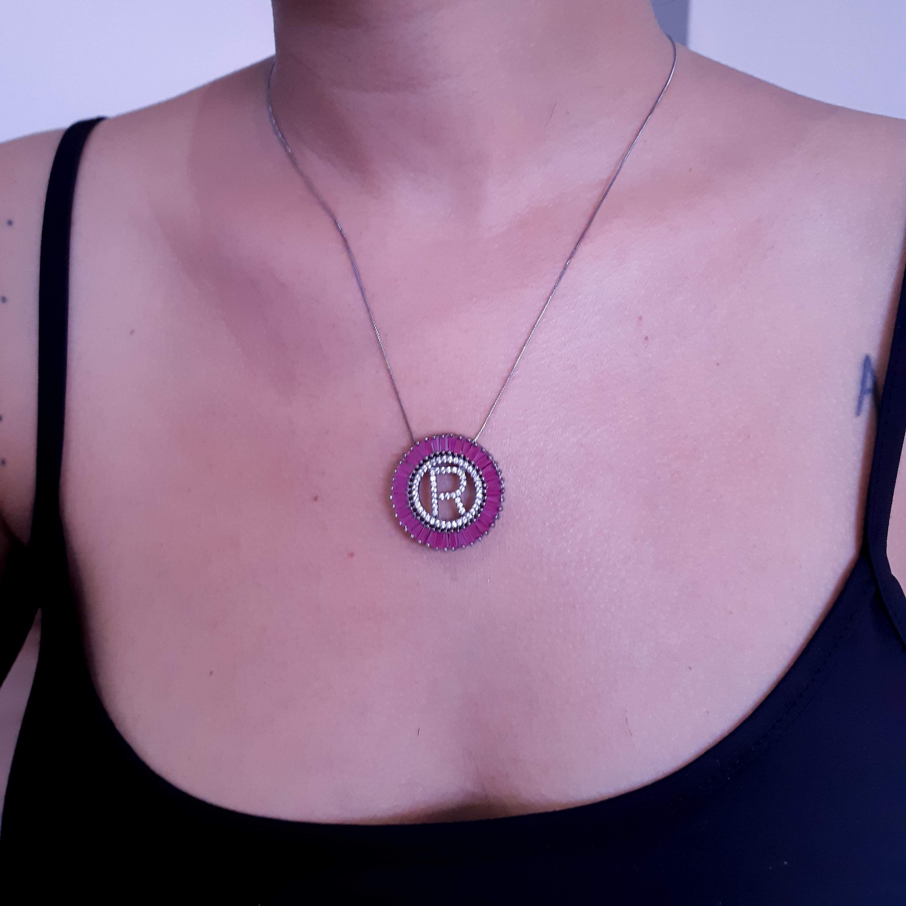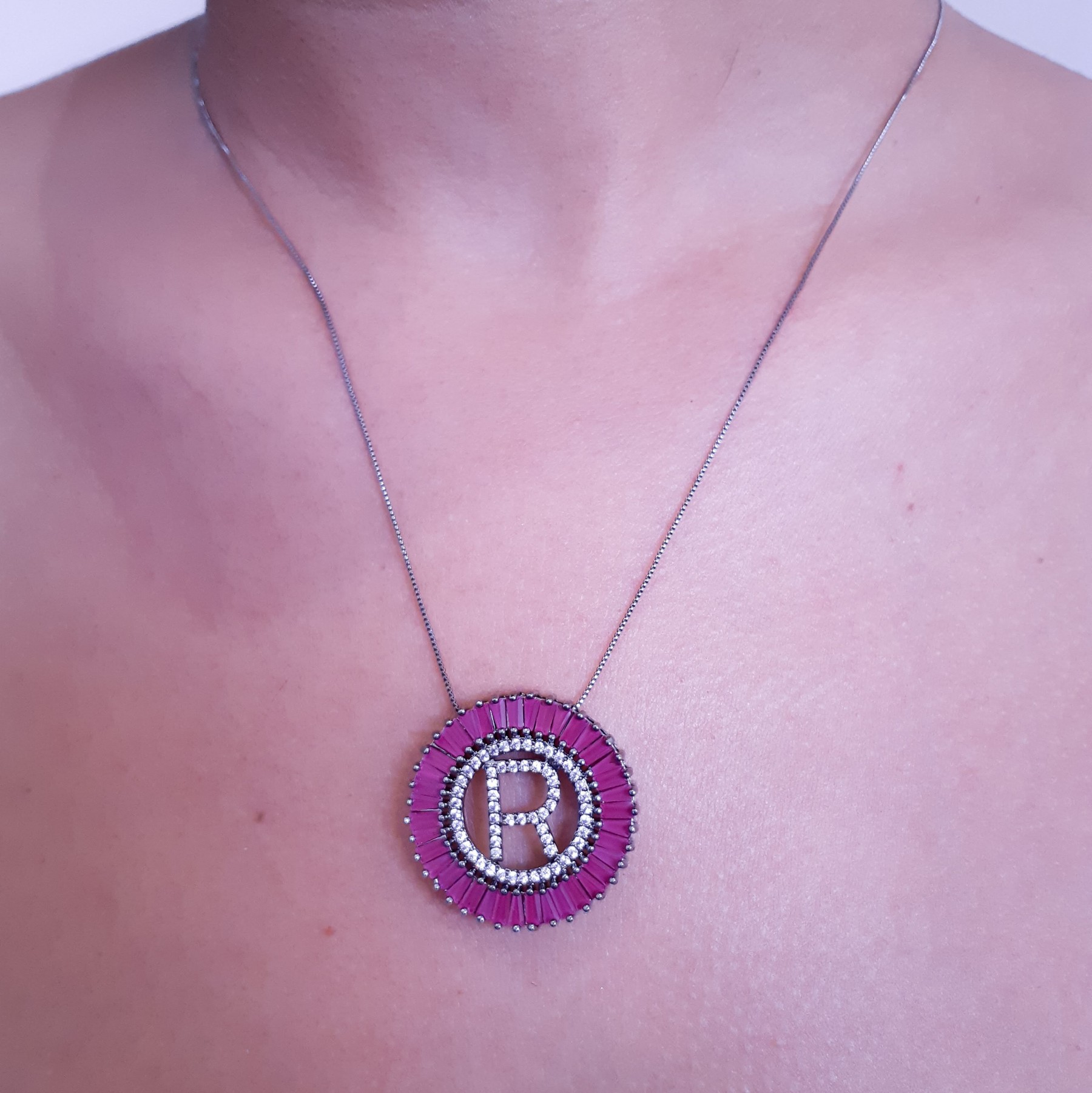 Descrição: corrente veneziana (fina) + pingente mandala com pedras zirconia coloridas e Letra em zircônia.  Disponivel nas cores verde, preto e rubi.